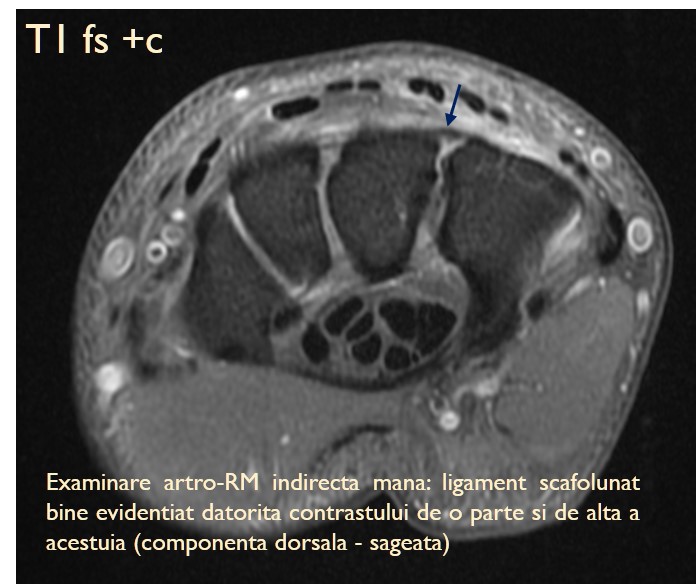 • Distensia buna a cavitatii articulare. De obicei se injecteaza o cantitate de substanta de contrast care sa umple cavitatea, sa destinda sinoviala/capsula articulara, in asa fel incat structurile din interior sa se separe si sa poata fi vizualizate separat (o mare parte din ligamente sunt ingrosari ale capsulei articulare si distensia acesteia ajuta vizualizarea)